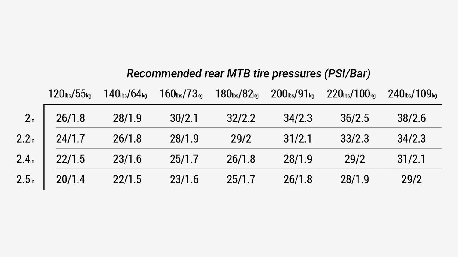 Bestimme das Fahrergewicht und definiere die Reifenbreite, um den empfohlenen Reifendruck zu ermitteln. Manchmal kann es von Vorteil sein, den Luftdruck im Vorderreifen etwas zu reduzieren. Wenn sich die Reifen zu weich oder zu hart anfühlen, kannst du den Luftdruck erhöhen oder verringern, um den Reifendruck an den jeweiligen Untergrund anzupasse