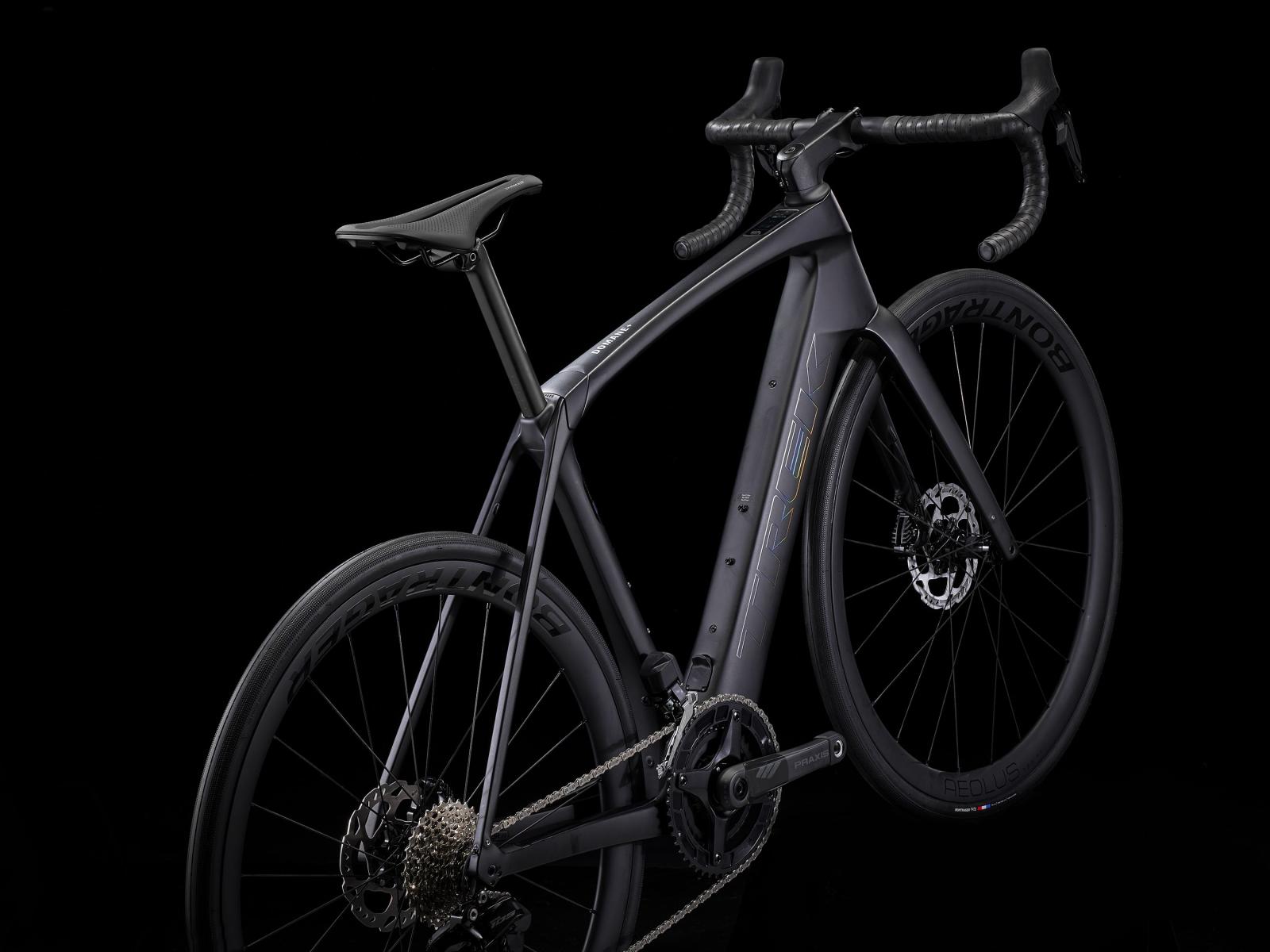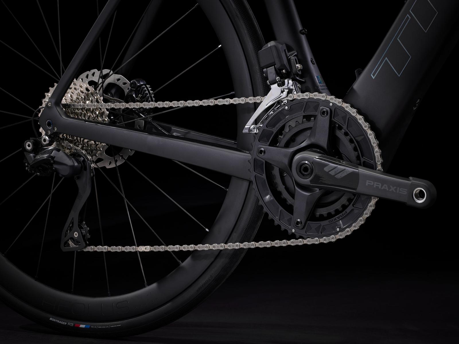 Einen äußerst leichten Rahmen aus 800 Series OCLV Carbon mit hinterem IsoSpeed. Einen kraftvollen Harmonic Pinring-Motor von TQ mit einem Drehmoment von 50 Nm, der dich bis zu einer Geschwindigkeit von 25 km/h unterstützt, einen 360 Wh großen integrierten Akku, ein in den Rahmen integriertes, smartes LED-Display und diskret in die Bremsgriffgummis verbaute Bedienelemente für das Umschalten der Unterstützungsmodi. Aeolus Pro 37-Laufräder aus OCLV Carbon, eine drahtlose, elektronische Shimano 105 Di2 2x12-Schaltung, eine Carbonkurbelgarnitur, ein vibrationsdämpfender Bontrager Pro IsoCore-Lenker und ein RCS Pro-Vorbau mit vollstän