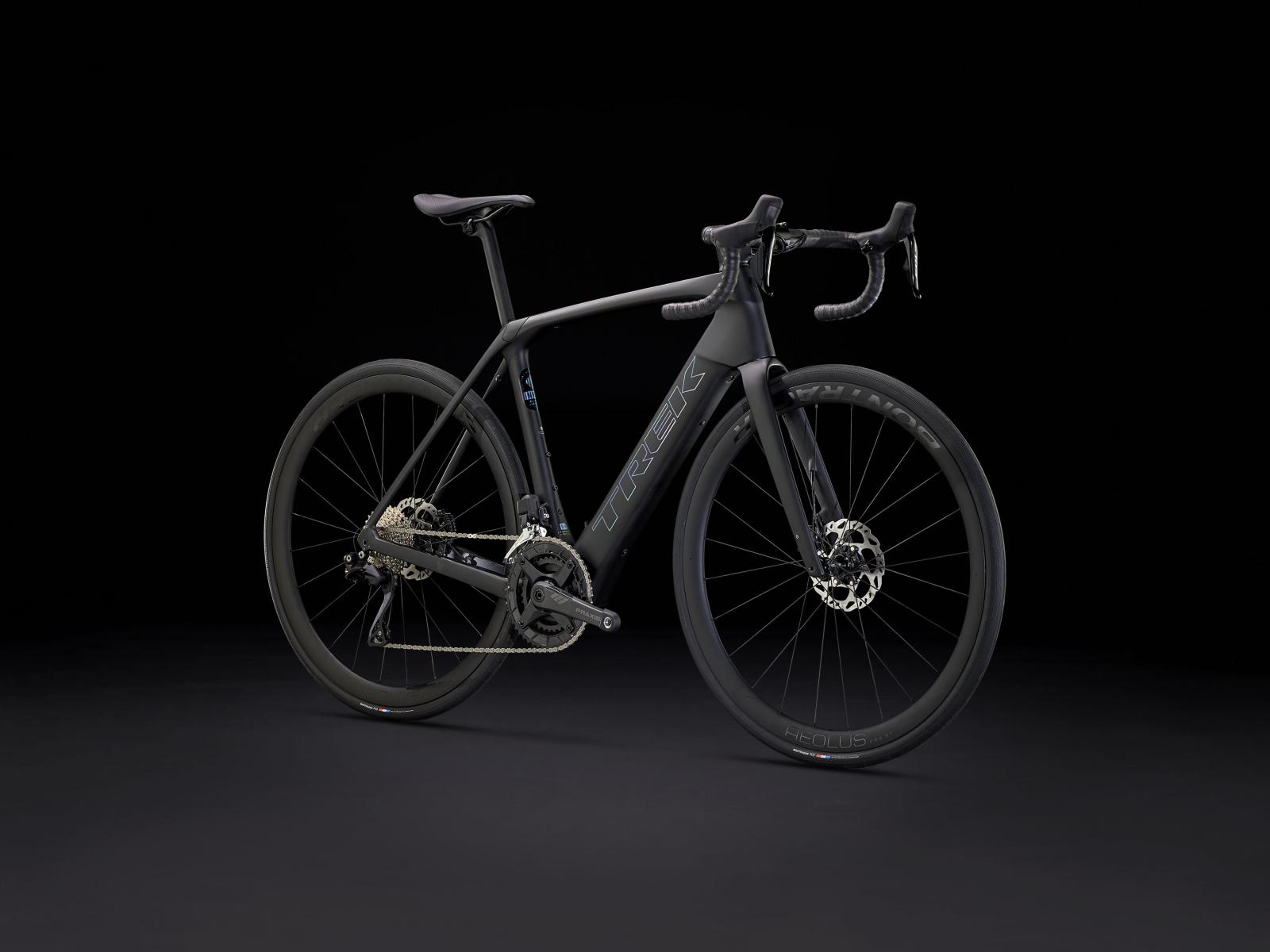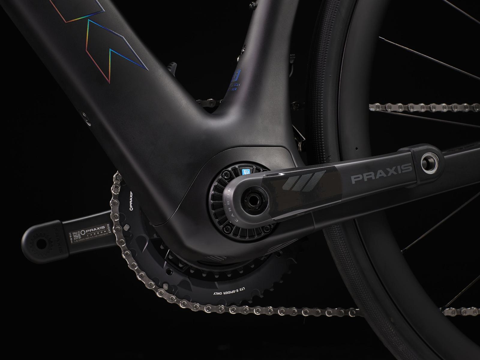 Einen äußerst leichten Rahmen aus 800 Series OCLV Carbon mit hinterem IsoSpeed. Einen kraftvollen Harmonic Pinring-Motor von TQ mit einem Drehmoment von 50 Nm, der dich bis zu einer Geschwindigkeit von 25 km/h unterstützt, einen 360 Wh großen integrierten Akku, ein in den Rahmen integriertes, smartes LED-Display und diskret in die Bremsgriffgummis verbaute Bedienelemente für das Umschalten der Unterstützungsmodi. Aeolus Pro 37-Laufräder aus OCLV Carbon, eine drahtlose, elektronische Shimano 105 Di2 2x12-Schaltung, eine Carbonkurbelgarnitur, ein vibrationsdämpfender Bontrager Pro IsoCore-Lenker und ein RCS Pro-Vorbau mit vollstän
