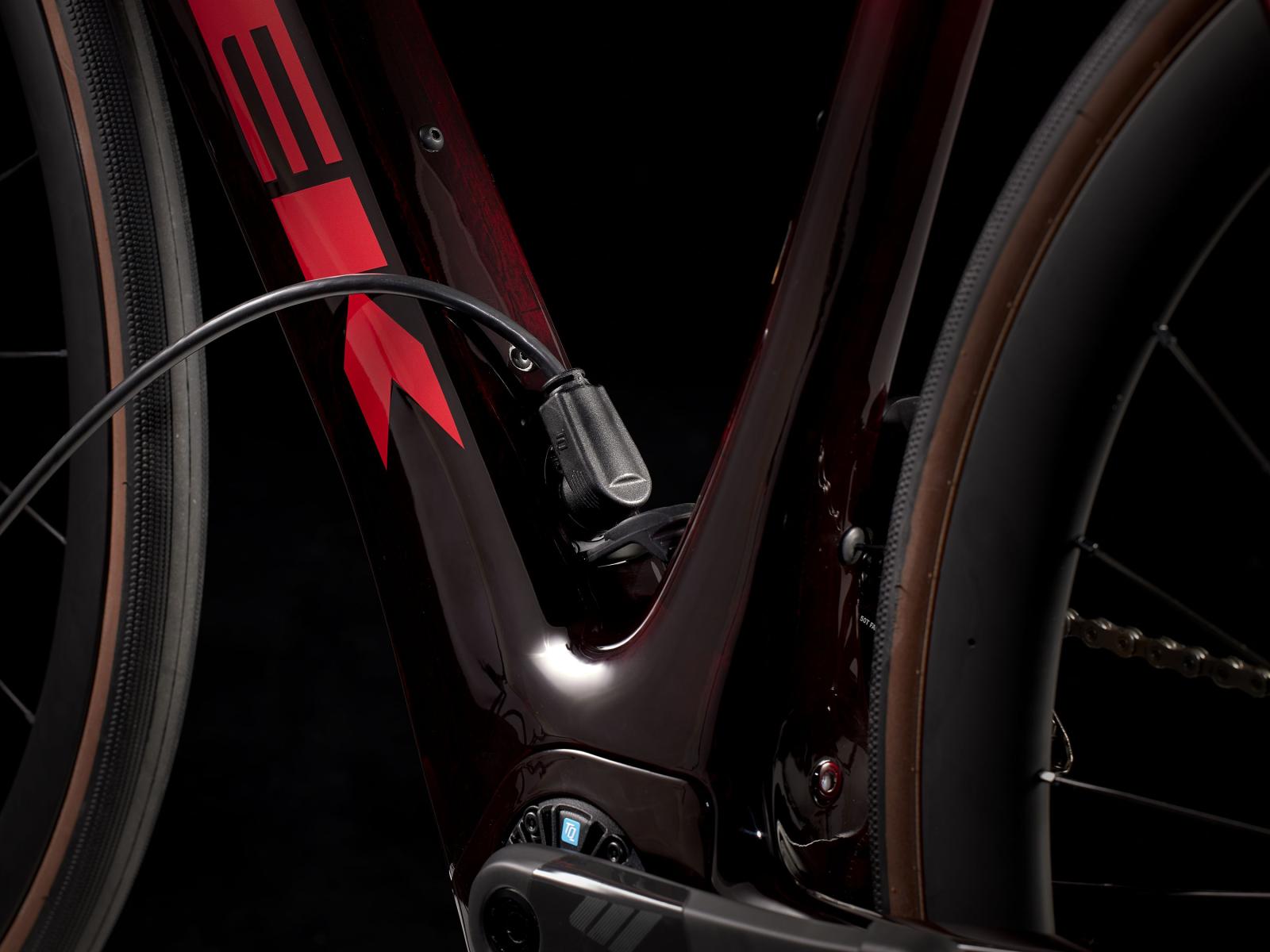 Einen äußerst leichten Rahmen aus 800 Series OCLV Carbon mit hinterem IsoSpeed. Einen kraftvollen Harmonic Pinring-Motor von TQ mit einem Drehmoment von 50 Nm, der dich bis zu einer Geschwindigkeit von 25 km/h unterstützt, einen 360 Wh großen integrierten Akku, ein in den Rahmen integriertes, smartes LED-Display und diskret in die Bremsgriffgummis verbaute Bedienelemente für das Umschalten der Unterstützungsmodi. Aeolus Pro 37-Laufräder aus OCLV Carbon, eine drahtlose, elektronische Shimano Ultegra Di2 2x12-Schaltung, eine Carbonkurbelgarnitur, ein vibrationsdämpfender Bontrager Pro IsoCore-Lenker und ein RCS Pro-Vorbau mit voll