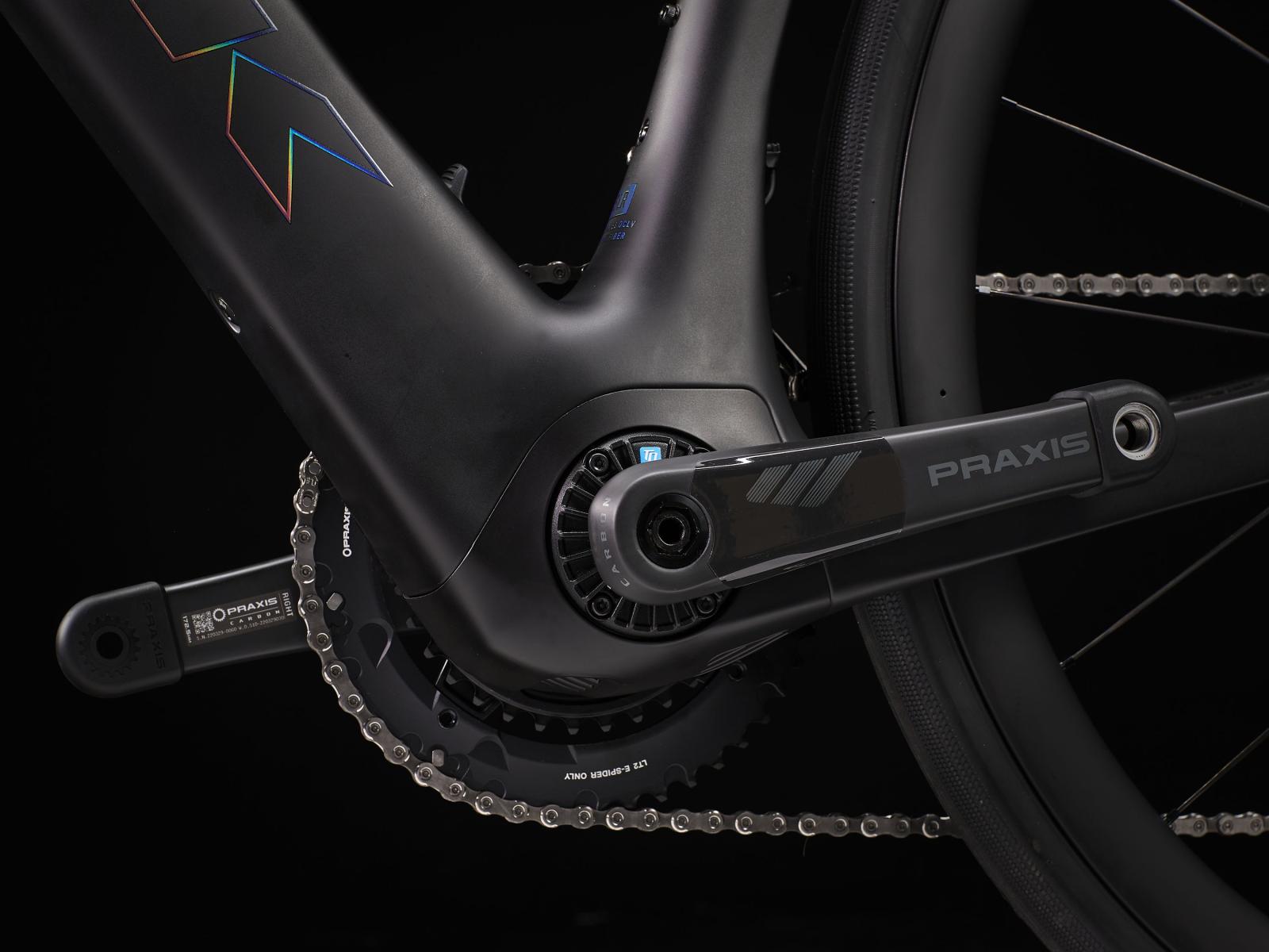 Einen äußerst leichten Rahmen aus 800 Series OCLV Carbon mit hinterem IsoSpeed. Einen kraftvollen Harmonic Pinring-Motor von TQ mit einem Drehmoment von 50 Nm, der dich bis zu einer Geschwindigkeit von 25 km/h unterstützt, einen 360 Wh großen integrierten Akku, ein in den Rahmen integriertes, smartes LED-Display und diskret in die Bremsgriffgummis verbaute Bedienelemente für das Umschalten der Unterstützungsmodi. Aeolus Pro 37-Laufräder aus OCLV Carbon, eine drahtlose, elektronische Shimano Ultegra Di2 2x12-Schaltung, eine Carbonkurbelgarnitur, ein vibrationsdämpfender Bontrager Pro IsoCore-Lenker und ein RCS Pro-Vorbau mit voll