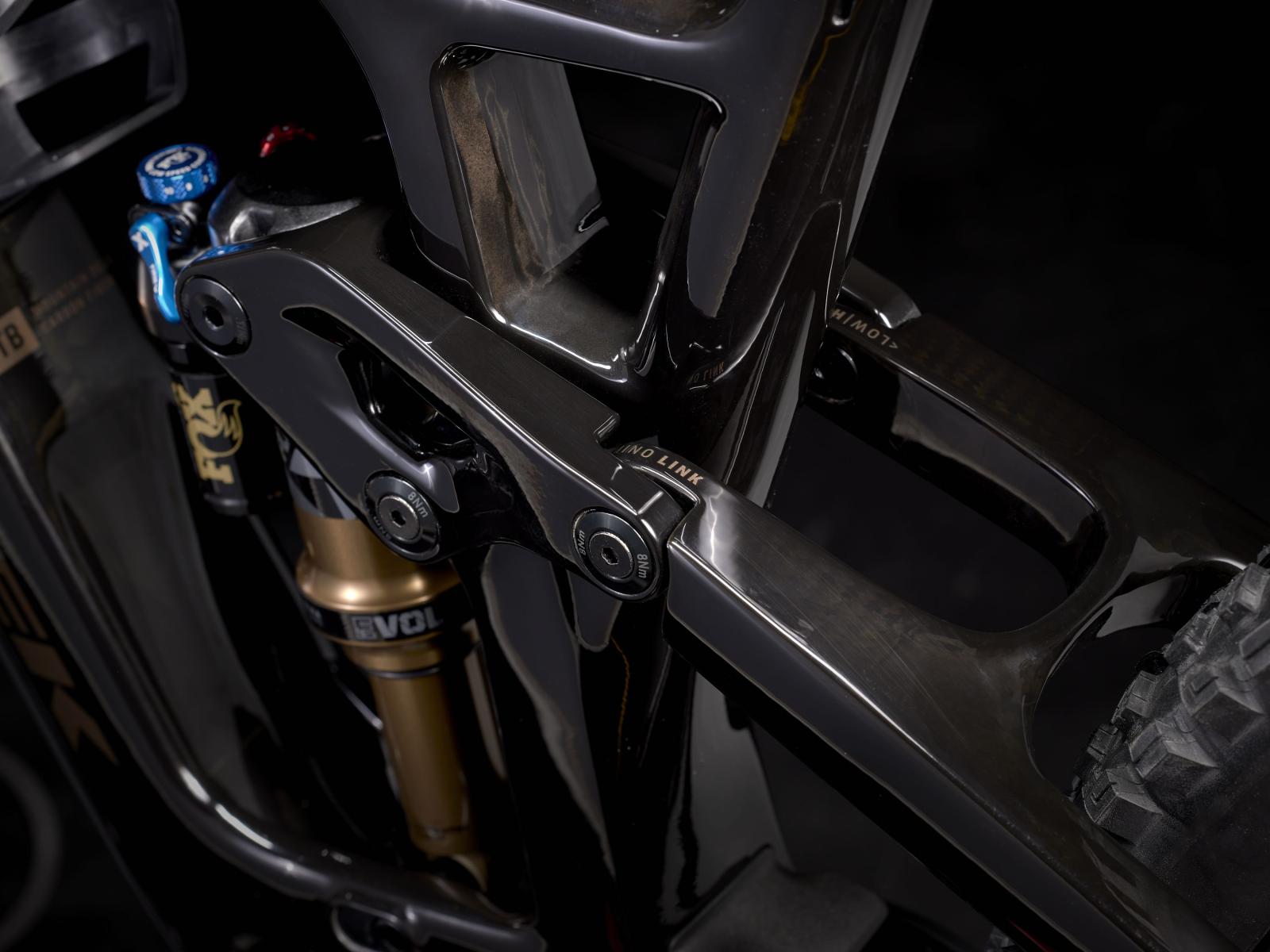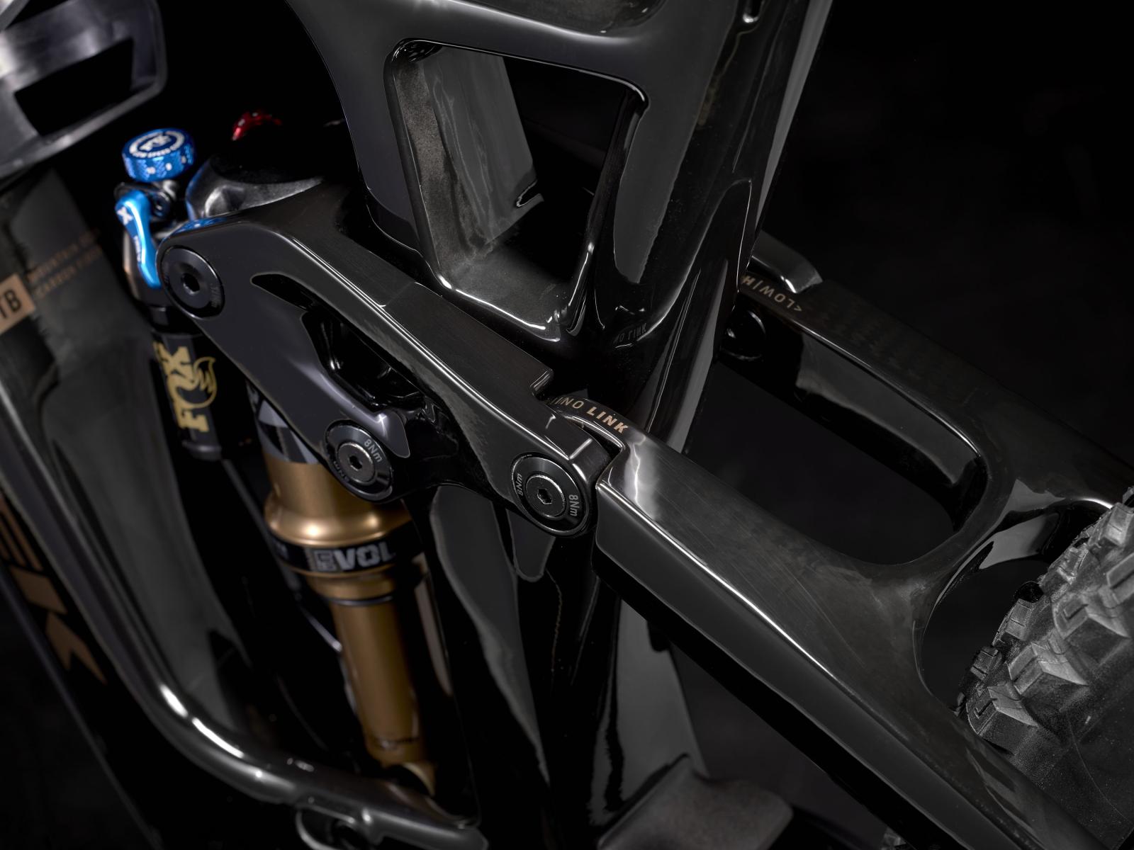 Rahmen: OCLV Mountain Carbon, integriertes Staufach, verstellbarer Steuersatzwinkel, per Mino Link abstimmbare Geometrie, einstellbare Progression, geführte interne Zugverlegung, Magnesiumumlenkhebel, 34,9 mm Sitzrohrdurchmesser, ISCG 05, 55 mm Kettenlinie, BSA 73, Unterrohrschutz, Shuttle-Guard, ABP