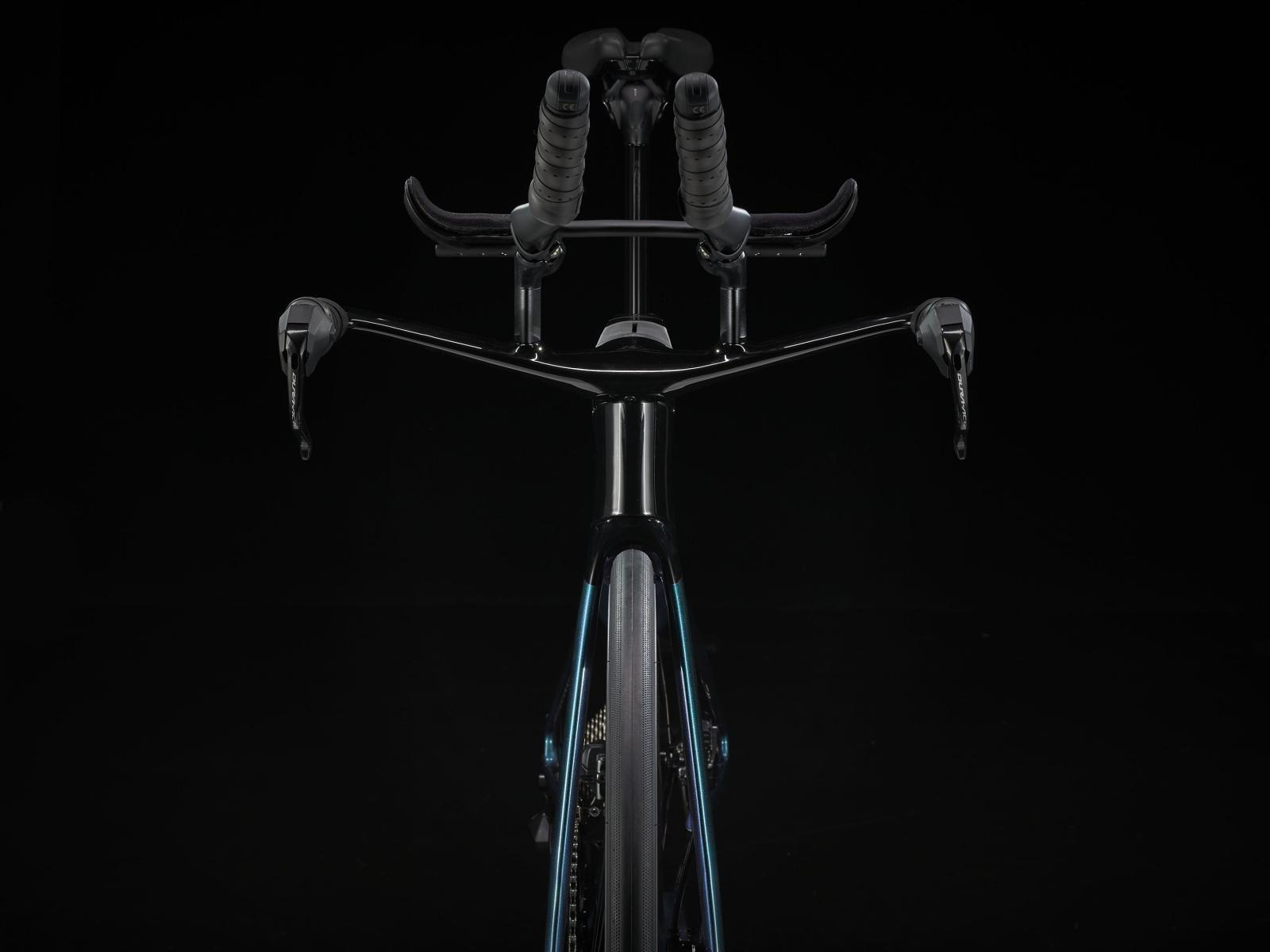 Einen ultraleichten Rahmen aus 800 Series OCLV Carbon, windschnittige Rohre mit Kammtail Virtual Foil Profil (KVF), eine Speed Concept Carbongabel mit aerodynamischem Profil, vibrationsdämpfendes IsoSpeed und integrierte Aufbewahrungslösungen für Verpflegung, Flüssigkeit und Pannenkit. Dazu gibt es einen drahtlosen, elektronischen Shimano Ultegra Di2 12fach-Antrieb, eine vollständig integrierte Lenker/Vorbau-Einheit, einen triathlonspezifischen Bontrager Hilo Comp Sattel für eine aggressive Aero-Sitzposition, Scheibenbremsen für zuverlässige Bremsleistung und Bontrager Aeolus Pro 51 Laufräder aus OCLV Carbon.