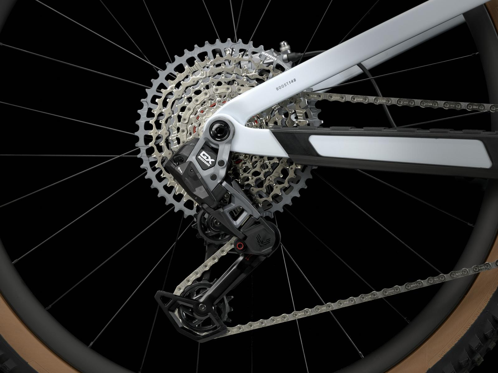 - SRAMs smarte, geschmeidige und komplett drahtlose GX Eagle AXS Transmission sorgt für saubere, auch unter Last präzise Gangwechsel.
