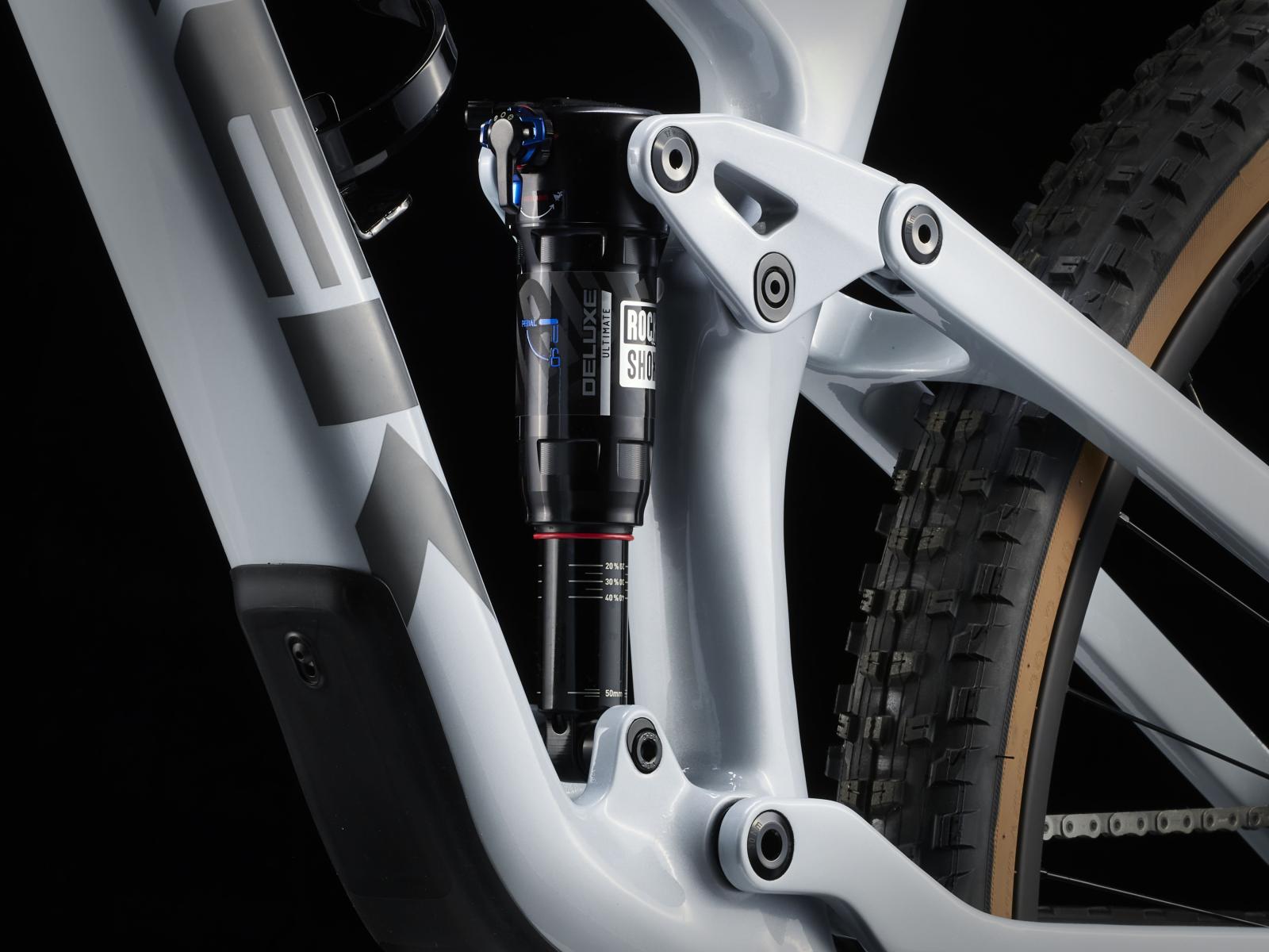 Einen leichten und steifen Vollcarbonrahmen, eine RockShox Pike Select+ Gabel mit 130 mm Federweg, einen RockShox Deluxe Ultimate RCT Dämpfer mit 120 mm Federweg und eine drahtlose, elektronische SRAM GX Eagle AXS Transmission mit extragroßem Klettergang mit 52 Zähnen. Außerdem kommt es mit breiten Bontrager Line Elite 30 Carbonlaufrädern samt Rapid Drive Nabe mit 108 Zähnen für einen verzögerungsfreien Kraftschluss, einer Bontrager Line Elite Variosattelstütze und einer integrierten Bontrager RSL Lenker/Vorbau-Einheit aus Carbon.