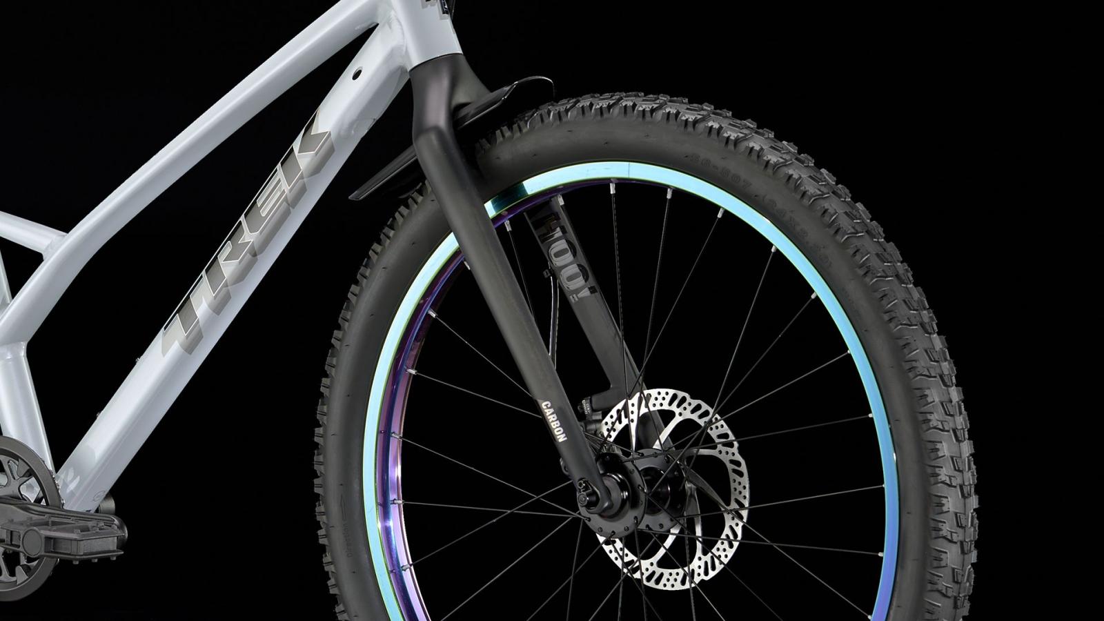 Einen Rahmen aus Alpha Silver Aluminium mit 24 Zoll großen Laufrädern und griffigen, 2,4 Zoll breiten Stollenreifen, die sich im Untergrund festbeißen und ein Plus an Traktion bieten. Dazu gibt es eine speziell auf Kinderbedürfnisse zugeschnittene Ausstattung, wie etwa die intuitive 9-Gang-Schaltung von microSHIFT und die kraftvoll zupackenden hydraulischen Scheibenbremsen.